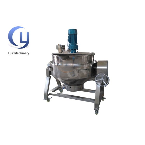 This industrial cooking pot using gas heating, automatic control of temperature, c pot. Tilting structure, and with four wheels (with brake device), easy to move. With a stirrer can be disassembled for easy cleaning. The motor is equipped with a protective cover to prevent fumes and dust. It is widely used in food processing such as jam,syrup,candy, dairy, beverages, candied fruit, canned, meat products, soy products and so on. It can also be used for large-scale restaurant or canteen soup, cooking, stew, It is a good equipment for food processing to improve the quality, shorten the time and improve the working conditions.